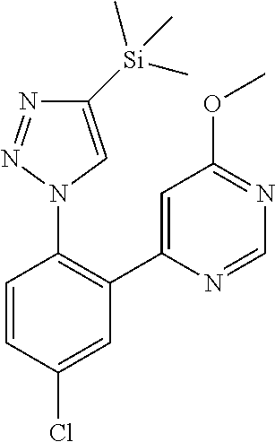To a solution of 4-chloro-2-(6-methoxypyrimidin-4-yl)aniline (1.0 g, 4.24 mmol), prepared as described in Example 358B, in ACN (60.6 ml) at 0° C. was added 3-methylbutyl nitrite (0.86 ml, 6.36 mmol) followed by the dropwise addition of azidotrimethylsilane (0.84 ml, 6.36 mmol). Gas evolution was observed. After 10 min, the ice bath was removed, and the reaction was allowed to warm to rt. (Caution, aryl azides are potentially explosive.) After 2 h, Cu2O (61 mg, 0.42 mmol) was added followed by a slow bubbling of 3,3,3-trifluoroprop-1-yne gas over a period of 5 min. After an additional 10 min, the reaction was partitioned between DCM and saturated aqueous NH4Cl and then the layers were separated. The organic layer was washed with brine, dried over MgSO4, filtered and concentrated. Purification by normal phase chromatography gave 4-{5-chloro-2-[4-(trifluoromethyl)-1H-1,2,3-triazol-1-yl]phenyl}-6-methoxypyrimidine (1.46 g, 97% yield) as a yellow solid. MS(ESI) m/z: 356.1 (M+H)+. 1H NMR (400 MHz, CDCl3) δ 8.62 (d, J=1.1 Hz, 1H), 8.00 (d, J=0.7 Hz, 1H), 7.75 (d, J=2.4 Hz, 1H), 7.66-7.60 (m, 1H), 7.52 (d, J=8.6 Hz, 1H), 6.60 (d, J=1.1 Hz, 1H), 3.98 (s, 3H). 19F NMR (376 MHz, CDCl3) δ −61.10 (s).