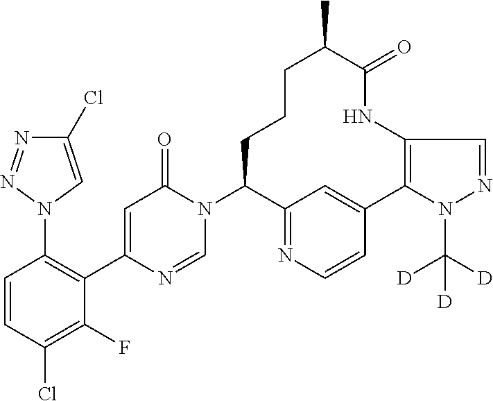 (9R,13S)-13-{4-[5-Chloro-2-(4-chloro-1H-1,2,3-triazol-1-yl)phenyl]-6-oxo-1,6-dihydropyrimidin-1-yl}-3-(2H3)methyl-9-methyl-3,4,7,17-tetraazatricyclo[12.3.1.02,6]octadeca-1(18),2(6),4,14,16-pentaen-8-one trifluoroacetate, (10.8 mg, 18%), a white solid, was prepared in the same manner as (9R,13S)-13-{4-[5-chloro-2-(4-chloro-1H-1,2,3-triazol-1-yl)phenyl]-6-oxo-1,6-dihydropyrimidin-1-yl}-3,9-dimethyl-3,4,7,17-tetraazatricyclo[12.3.1.02,6]octadeca-1(18),2(6),4,14,16-pentaen-8-one, as described in Example 362, by replacing (9R,13S)-13-amino-3,9-dimethyl-3,4,7,17-tetraazatricyclo[12.3.1.02,6]octadeca-1(18),2(6),4,14,16-pentaen-8-one, prepared as described in Example 361E with (9R,13S)-13-amino-3-(2H3)methyl-9-methyl-3,4,7,17-tetraazatricyclo[12.3.1.02,6]octadeca-1(18),2(6),4,14,16-pentaen-8-one, prepared as described in Example 363F. MS(ESI) m/z: 593.3 (M+H)+. 1H NMR (400 MHz, CD3OD) δ 8.78-8.69 (m, 1H), 8.42-8.33 (m, 2H), 7.92-7.86 (m, 2H), 7.80-7.74 (m, 1H), 7.69-7.64 (m, 1H), 7.52 (s, 1H), 7.21 (dd, J=5.3, 1.5 Hz, 1H), 6.51-6.43 (m, 1H), 5.77 (dd, J=12.5, 3.3 Hz, 1H), 2.62 (ddd, J=9.5, 6.7, 3.4 Hz, 1H), 2.48-2.38 (m, 1H), 2.22-2.11 (m, 1H), 2.06-1.97 (m, 1H), 1.69-1.59 (m, 1H), 1.42-1.33 (m, 2H), 1.15 (d, J=6.8 Hz, 3H). Analytical HPLC (Method A) RT=7.26 min, purity=96%.