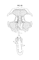 FIGS. 8F-8H show schematic diagrams illustrating the use of a device similar to that shown in FIGS. 6, 7 and 8A-D, modified to deploy a stent in an internal passageway after the passageway has been enlarged or cleared by delivery of acoustic energy delivered, for example, by the same device. FIG. 8F shows insertion of the device and initial deployment of the stent over a guide; FIG. 8G shows further deployment of the stent along the guide in the osteomeatal complex; and FIG. 8H shows final positioning of the stent in the osteomeatal complex.