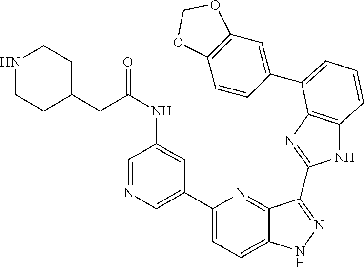 - CXDLZYGYQLNKDZ-UHFFFAOYSA-N C1=CC2=C(N=C(C3=NNC4=CC=C(C5=CN=CC(OC6CCNCC6)=C5)N=C43)N2)C(C2=CC=NC=C2)=C1 Chemical compound C1=CC2=C(N=C(C3=NNC4=CC=C(C5=CN=CC(OC6CCNCC6)=C5)N=C43)N2)C(C2=CC=NC=C2)=C1 CXDLZYGYQLNKDZ-UHFFFAOYSA-N 0.000 description 2