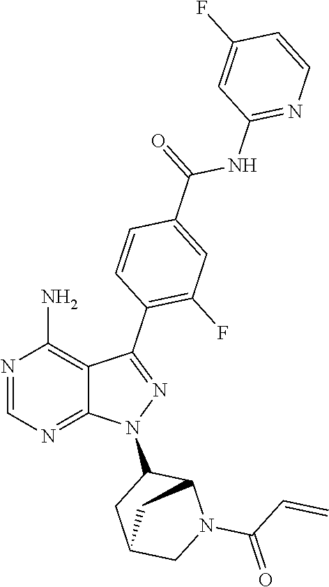 - 10) 3-(1-(2-acryloyl-2-azabicyclo[2.2.1]heptan-6-yl)-4-amino-1H-pyrazolo[3,4-d]pyrimidin-3-yl)-N-(4-isopropyl-3-methylphenyl)benzamide,