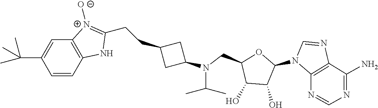 Compound A The protonated molecular ion of Compound A was m/z 563. The proposed fragmentation pathway is shown in FIG. 6D. Loss of the adenine ring gave m/z 428, with m/z 136 corresponding to the protonated adenine ring itself. Loss of the adenosine moiety gave m/z 326, due to the neutral loss of both the tetrahydrofuran and adenine ring systems. Cleavage at the N-cyclobutyl bond gave rise to m/z 255 corresponding to the protonated t-butyl-benzimidazole-cyclobutyl portion of Compound A. Metabolites showed similar fragmentation pathways, which allowed the elucidation and assignment of metabolite structures.