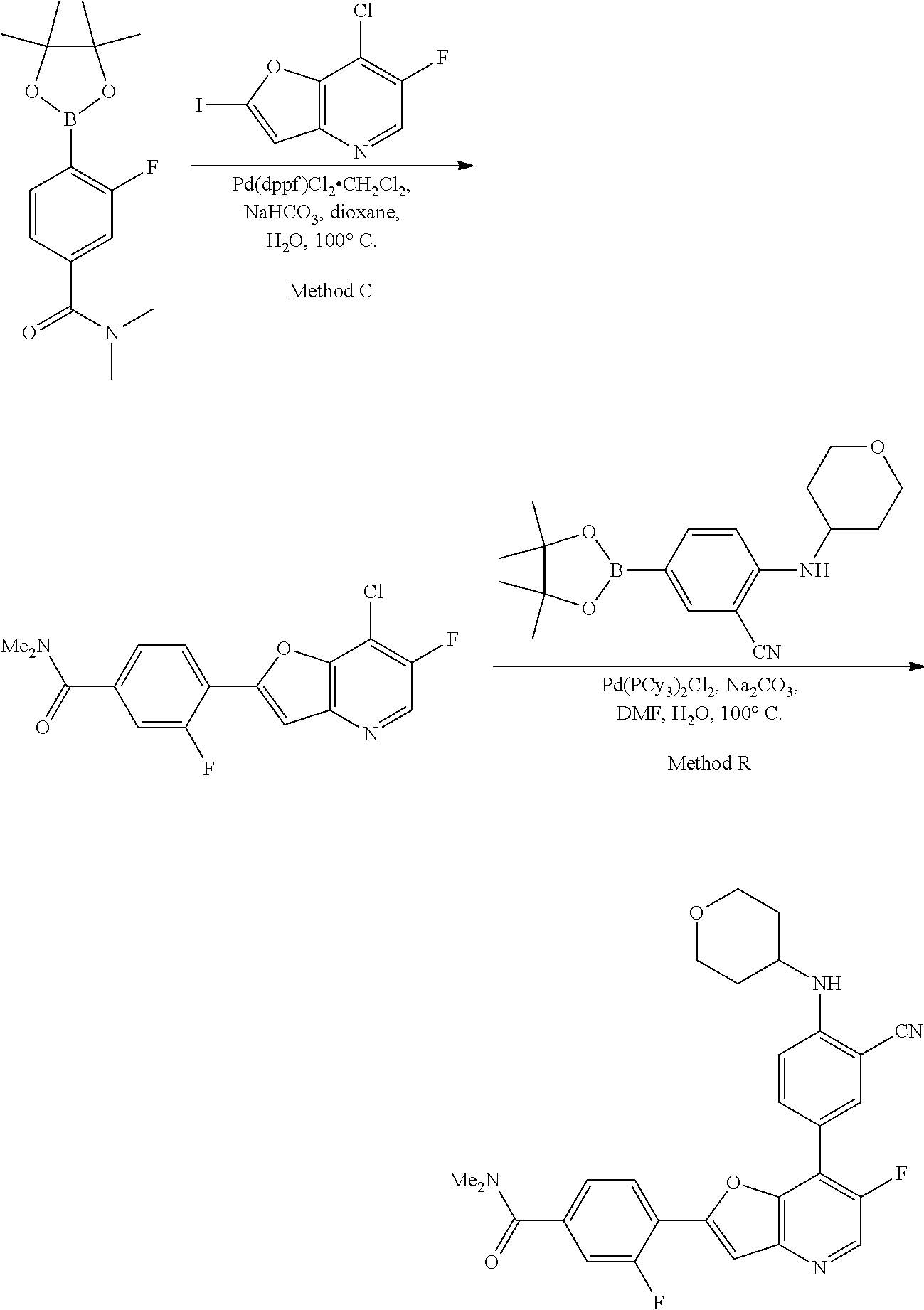 The title compound was prepared from 7-chloro-6-cyclopropyl-2-iodofuro[3,2-b]pyridine, 6-iodo-5-methoxy-N,N-dimethylnicotinamide, and 2-(tetrahydro-2H-pyran-4-ylamino)-5-(4,4,5,5-tetramethyl-1,3,2-dioxaborolan-2-yl)benzonitrile using Methods 12b, 12a and O. The final product were purified by prep-HPLC under the following conditions: column, XBridge Shield RP18 OBD Column, 5 um, 19×150 mm; mobile phase, acetonitrile in water (with 10 mmol/L NH4HCO3), 20% to 50% gradient in 8 min; detector, UV 254/220 nm. 6-(7-[3-cyano-4-[(oxan-4-yl)amino]phenyl]-6-cyclopropylfuro[3,2-b]pyridin-2-yl)-5-methoxy-N,N-dimethylpyridine-3-carboxamide was obtained as a white solid (4 mg, 7% for 3 steps). HPLC: 99.9% purity, RT=0.82 min. MS: m/z=538.2 [M+H]+. 1H NMR (300 MHz, CD3OD, ppm) δ 8.26 (d, J=1.6 Hz, 2H), 7.83-7.64 (m, 4H), 7.06 (d, J=8.8 Hz, 1H), 4.87 (br s, 2H), 4.56 (s, 1H), 4.09 (s, 3H), 4.05-3.94 (m, 2H), 3.87-3.73 (m, 1H), 3.63-3.51 (m, 2H), 3.11 (s, 3H), 3.04 (s, 3H), 2.10-1.94 (m, 3H), 1.73-1.60 (m, 2H), 1.04-0.91 (m, 2H), 0.80-0.68 (m, 2H).