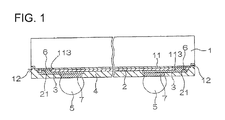 The rewirings 3 are composed of a metal material such as copper, and provided on a surface of the stress relieving layer 2 as extending to positions opposed to the respective metal balls 5 with the intervention of the sealing resin layer 4.
