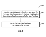 At block 304, the scan point data may be processed based on identifying the potential anomaly. In some embodiments, processing the scan point data may include removing scan point data associated with the potential anomaly, marking scan point data associated with the potential anomaly, and/or directing the laser to perform another scan of the setting.
