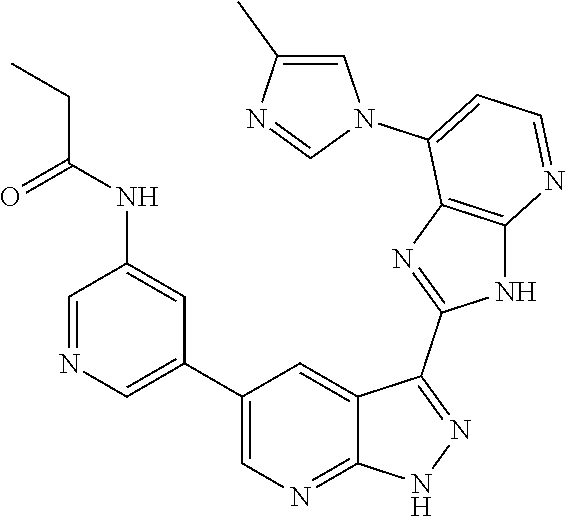 - NXDFXGPJVJRARR-UHFFFAOYSA-N CCC(=O)NC1=CC(C2=CN=C3NN=C(C4=NC5=C(N=CC=C5C5=CC(OCCN(C)C)=CC(F)=C5)N4)C3=C2)=CN=C1 Chemical compound CCC(=O)NC1=CC(C2=CN=C3NN=C(C4=NC5=C(N=CC=C5C5=CC(OCCN(C)C)=CC(F)=C5)N4)C3=C2)=CN=C1 NXDFXGPJVJRARR-UHFFFAOYSA-N 0.000 description 2
