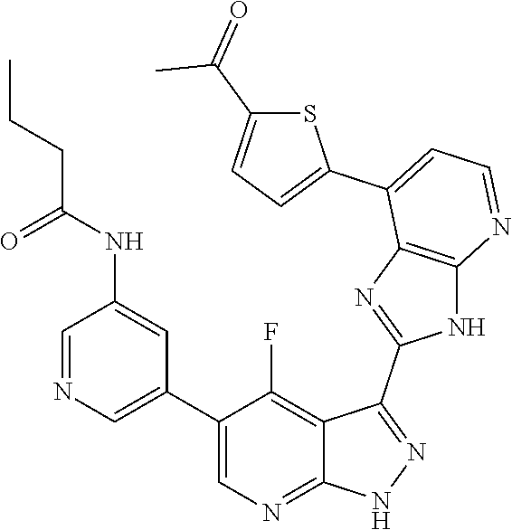- AVZVFVPBMYHUDT-UHFFFAOYSA-N CC1=CC=C(C2=CC=NC3=C2N=C(C2=NNC4=NC=C(C5=CN=CC(NC(=O)CC(C)(C)C)=C5)C(F)=C42)N3)S1 Chemical compound CC1=CC=C(C2=CC=NC3=C2N=C(C2=NNC4=NC=C(C5=CN=CC(NC(=O)CC(C)(C)C)=C5)C(F)=C42)N3)S1 AVZVFVPBMYHUDT-UHFFFAOYSA-N 0.000 description 2