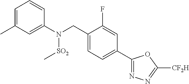 - FPBMSTFEAXNETL-UHFFFAOYSA-N CS(=O)(=O)N(CC1=CC=C(C2=NN=C(C(F)F)O2)C=N1)C1=CC(Cl)=CC=C1 Chemical compound CS(=O)(=O)N(CC1=CC=C(C2=NN=C(C(F)F)O2)C=N1)C1=CC(Cl)=CC=C1 FPBMSTFEAXNETL-UHFFFAOYSA-N 0.000 description 4