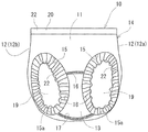 As shown in FIG. 3, the front covering portion 11 is formed at the lower end thereof with high-thigh-size formation portions 15 which are bilaterally symmetrical and each coved upward. A hip hemline 15 a which occupies a substantially rear half of the inner periphery of the high-thigh-size formation portion 15 is formed into a convex arcuately curved edge which protrudes toward a front center line S1 vertically running through the middle in the lateral directions of the front covering portion 11.