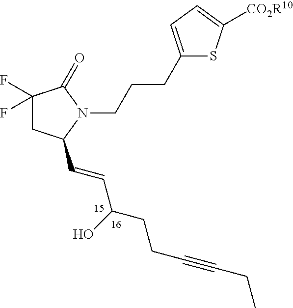 The physiology of PGE2 and the pharmacology of its four known complementary receptor subtypes designated EP1, EP2, EP3, and EP4 are among the most widely studied and published fields of PG research (Sugimoto, Y. et al., J. Biol. Chem. 2007, 282(16), 11613-11617; Suzuki, J. et al., Prostaglandins 2010, 127-133; Regan, J. et al., Life Sciences 2003, 74(2-3), 143-153; Bouayad, A. et al., Current Ther. Res. 2002, 63(10), 669-681; Breyer, M. et al., Kidney Int, Suppl. 1998, 67, S88-S94; Breyer, M. et al., Amer. J. Physiol. 2000, 279(1, Part 2), F12-F23; Negishi, M. et al., Recent Res. Dev. Endocrinol. 2000, 1(1), 133-143; Ma, W. et al., Prog. Inflamm. Res. 2006, 39-93; Mutoh, M. et al., Current Pharmaceutical Design 2006, 12(19), 2375-2382; Hebert, R. et al., Current Topics in Pharmacology 2002, 6, 129-137; Coleman, R. et al., Pharm. Rev. 1994, 46(2), 205-229). PGE2 binds to each of the four EP receptors with high affinity (Anderson, L. et al., Journal of Reproduction and Fertility, 1999, 116, 133-141). The prostaglandin PGE1 (saturated α-chain analog of PGE2), the major eicosanoid synthesized biologically from dihomo-γ-linolenic acid (DGLA) in response to various stimuli, also binds efficiently to all four EP receptor subtypes.