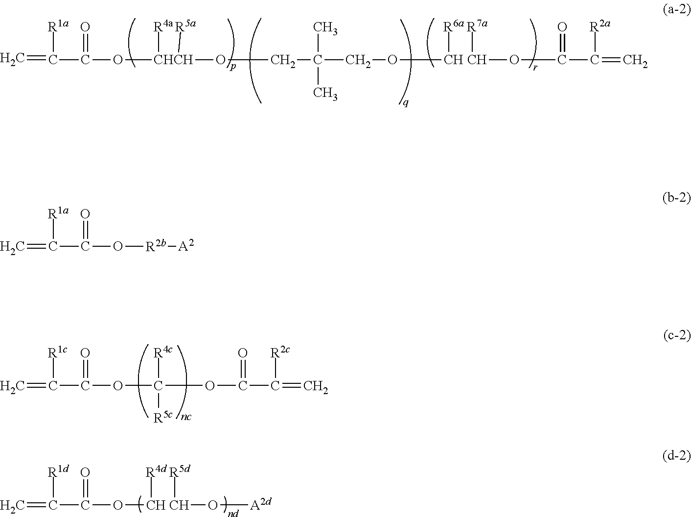 - in Formula (b-2), R1b represents a hydrogen atom or a methyl group; R2b represents a single bond or a methylene group; and A2 represents a ring structure containing a dicyclopentenyl skeleton, a dicyclopentanyl skeleton, a cyclohexane skeleton, a tetrahydrofuran skeleton, a morpholine skeleton, an isobornyl skeleton, a norbornyl skeleton, a dioxolane skeleton, or a dioxane skeleton;