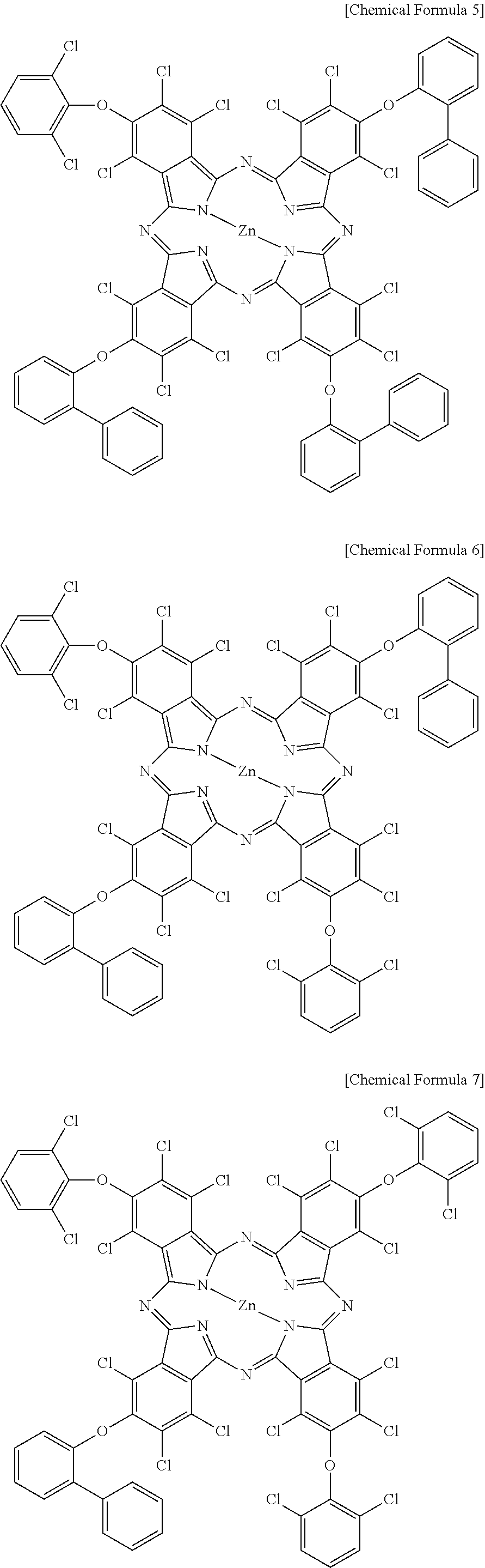 The lower a base line is within the above wavelength range, the higher transmittance (luminance) in a high color region is obtained. As for an absorption peak appearing between 600 nm to 730 nm, a higher peak indicates higher color strength, and herein, a dye of the present invention shows an about 1.5 times as high a peak as and thus has higher color strength than C.I. pigment green 58 and C.I. pigment green 59. Thus, when the dye of the present invention is used along with C.I. pigment green 58, C.I. pigment green 59, C.I. pigment yellow 138, and the like, a higher color coordinate may be realized.