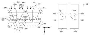 As shown in FIG. 10, each microlens 611 causes collimated focused light 1001 to converge so light converges on an optical area 1004 c, 1005 c of each PD 634, 635. The optical area 1004 c, 1005 c of each photodiode 634, 635 is the portion of the area of the photodiode illuminated by the incoming light. Curved peripheral region 611 a causes incoming light to bend radially inward, toward central axis C. Light incident on planar top surface 611 b proceeds in the same direction.