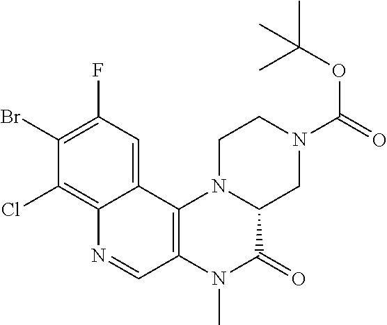To a yellow suspension of tert-butyl (8aR)-3-bromo-2,4-dimethyl-8-oxo-7,8,8a,9,11,12-hexahydro-10H-pyrazino[1′,2′:4,5]pyrazino[2,3-c][1,5]naphthyridine-10-carboxylate (1.71 g, 3.70 mmol) and K2CO3 (1.02 g, 7.40 mmol) in acetone (25 ml) at rt was added iodomethane (2.30 ml, 36.99 mmol). The resultant suspension was heated at 40° C. for 18 h. Further K2CO3 (0.50 g) and iodomethane (2.30 ml) were added and reaction continued heating at 40° C. for additional 24 h. The reaction mixture was concentrated in vacuo and the crude residue dissolved in DCM and water added. The phases were separated, the organic layer washed with water and brine. The aqueous layers were back extracted with DCM and the combined organic layers dried (phase separator) and concentrated in vacuo to afford the crude product as an orange solid. This was suspended in diethyl ether and was then concentrated in vacuo to give tert-butyl (8aR)-3-bromo-2,4,7-trimethyl-8-oxo-7,8,8a,9,11,12-hexahydro-10H-pyrazino[1′,2′:4,5]pyrazino[2,3-c][1,5]naphthyridine-10-carboxylate (1.35 g, 77%) as an orange solid; 1H NMR (400 MHz, DMSO, 30° C.) 1.44 (9H, s), 2.52-2.53 (1H, m), 2.76 (3H, s), 2.80 (3H, s), 3.08-3.19 (1H, m), 3.36-3.43 (1H, m), 3.44 (3H, s), 3.89 (1H, d), 4.12 (1H, s), 4.19 (1H, dd), 5.84 (1H, s), 8.62 (1H, s); m/z: ES+ [M+H]+ 476.3.