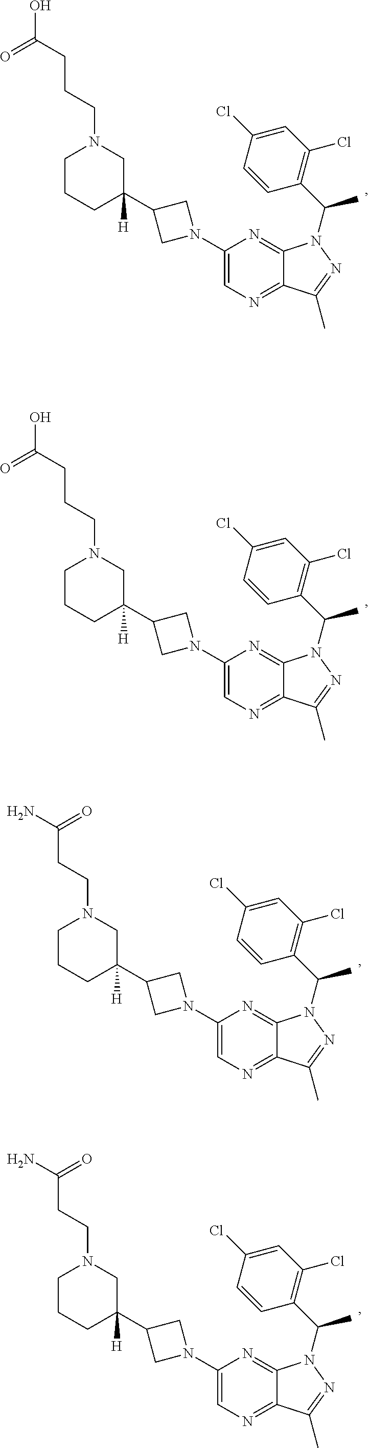 - LBENTOCVBASFEW-PXQDEPQWSA-N [H][C@@]1(C2CN(C3=CN=C4C(C#N)=NN([C@H](C)C5=C(Cl)C=C(Cl)C=C5)C4=N3)C2)CCCN(CCS(C)(=O)=O)C1.[H][C@@]1(C2CN(C3=NC=C4C(C)=NN([C@H](C)C5=C(Cl)C=C(Cl)C=C5)C4=N3)C2)CCCN(CCCC(=O)O)C1.[H][C@]1(C2CN(C3=CN=C4C(C#N)=NN([C@H](C)C5=C(Cl)C=C(Cl)C=C5)C4=N3)C2)CCCN(CCCC(=O)O)C1.[H][C@]1(C2CN(C3=NC=C4C(C)=NN([C@H](C)C5=C(Cl)C=C(Cl)C=C5)C4=N3)C2)CCCN(CCCC(=O)O)C1 Chemical compound [H][C@@]1(C2CN(C3=CN=C4C(C#N)=NN([C@H](C)C5=C(Cl)C=C(Cl)C=C5)C4=N3)C2)CCCN(CCS(C)(=O)=O)C1.[H][C@@]1(C2CN(C3=NC=C4C(C)=NN([C@H](C)C5=C(Cl)C=C(Cl)C=C5)C4=N3)C2)CCCN(CCCC(=O)O)C1.[H][C@]1(C2CN(C3=CN=C4C(C#N)=NN([C@H](C)C5=C(Cl)C=C(Cl)C=C5)C4=N3)C2)CCCN(CCCC(=O)O)C1.[H][C@]1(C2CN(C3=NC=C4C(C)=NN([C@H](C)C5=C(Cl)C=C(Cl)C=C5)C4=N3)C2)CCCN(CCCC(=O)O)C1 LBENTOCVBASFEW-PXQDEPQWSA-N 0.000 description 2