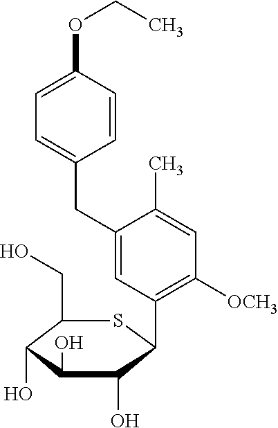 - (13) 1-(β-D-glucopyranosyl)-4-methyl-3-[5-(4-fluorophenyl)-2-thienylmethyl]benzene as described in WO 2005/012326, represented by formula (13);