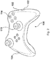 FIG. 2 illustrates a controller 100, according to an embodiment of the invention. In one embodiment, controller 100 is identical to controller 30 of FIG. 1. Further, FIG. 3 illustrates another view of controller 100. Controller 100 may be generally used with a gaming system that may be connected to a computer, mobile phone, television, or other similar device. Components of controller 100 illustrated in FIGS. 2 and 3 (i.e., housing 102, analog or digital stick 110, button 114, trigger 118, and rumble actuators 122 and 124) are further described below in greater detail in conjunction with FIG. 4.