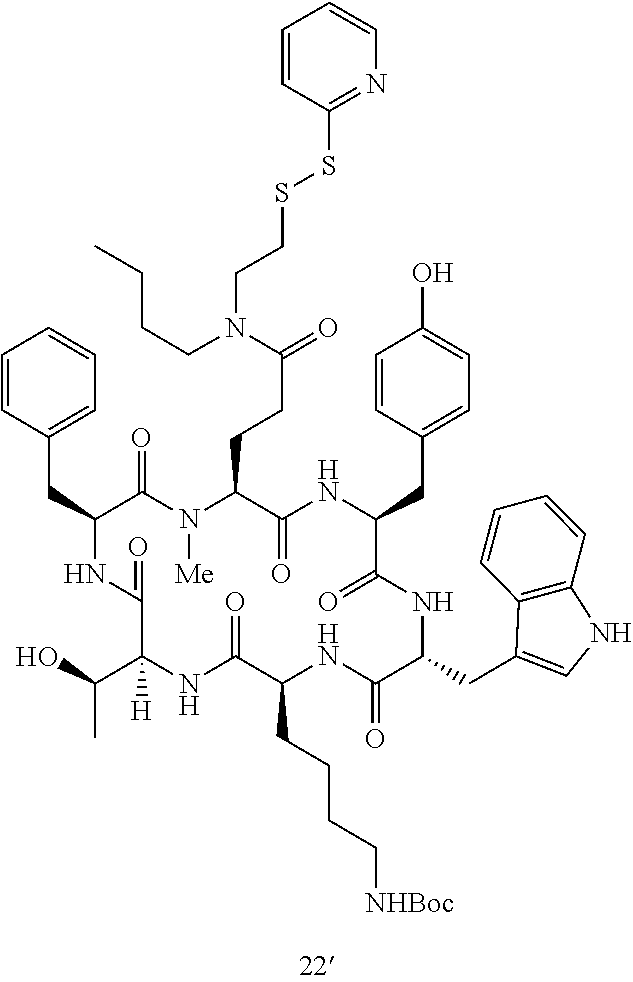 In addition, the toxicity of a conjugate containing a somatostatin targeting moiety linked to an active agent for cells that do not express SSTRs is predicted to be decreased compared to the toxicity of the active agent alone. Without committing to any particular theory, applicants believe that this feature is because the ability of the conjugated active agent to enter a cell is decreased compared the ability to enter a cell of the active agent alone. Accordingly, the conjugates comprising an active agent and particles containing the conjugates as described herein generally have decreased toxicity for non-SSTR expressing cells and at least the same or increased toxicity for SSTR expressing cells compared to the active agent alone.