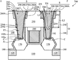 FIG. 12 is a cross-sectional view illustrating a semiconductor device structure 700A, in accordance with some embodiments. As shown in FIG. 12, the semiconductor device structure 700A is similar to the semiconductor device structure 700 of FIG. 7G, except that the inner walls 252 b, 254 b, and 192 b of the recesses 252, 254, and 192 of the semiconductor device structure 700A are curved inner walls, in accordance with some embodiments. The barrier layers 260A, 270A, and 280 conformally covers the inner walls 252 b, 254 b, and 192 b, in accordance with some embodiments. The inner walls 252 b, 254 b, and 192 b are discontinuous, in accordance with some embodiments.