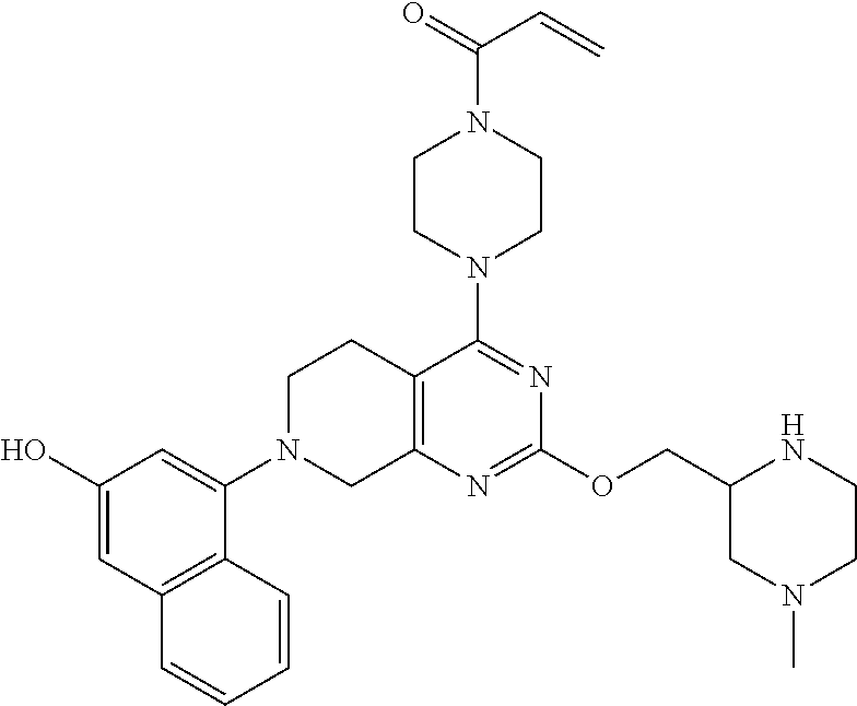 NCI-H358 cells (ATCC CRL-5807) express KRas G12C and were grown in RPMI medium supplemented with 10% fetal bovine serum, penicillin/streptomycin and 10 mM HEPES. Cells were plated in poly-D-Lysine coated 96-well plates at a concentration of 50,000 cells/well and allowed to attach for 8-12 hours. Diluted compounds were then added at a final concentration of 0.5% DMSO. After 3 hours, the medium was removed, 150 μL of 4% formaldehyde was added and the plates were incubated for 20 minutes. The plates were washed with PBS, and permeabilized using 150 μL of ice cold 100% methanol for 10 minutes. Non-specific antibody binding to the plates was blocked using 100 μL Licor Blocking Buffer (Li-Cor Biotechnology, Lincoln Nebr.) for 1 hour at room temperature. Positive control samples and samples lacking cells were parallel processed with test samples as standards.