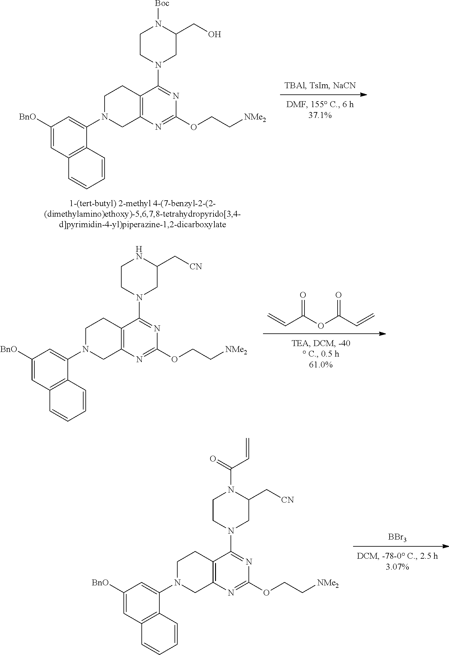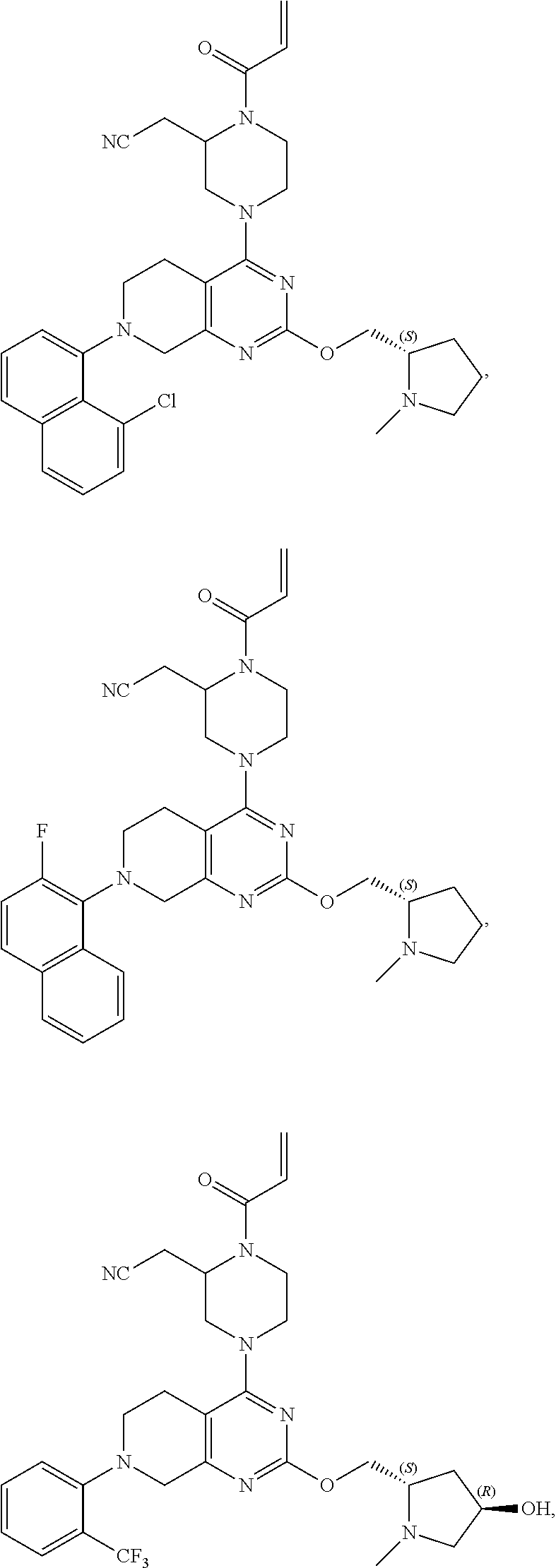 As used herein, the term “subject,” “individual,” or “patient,” used interchangeably, refers to any animal, including mammals such as mice, rats, other rodents, rabbits, dogs, cats, swine, cattle, sheep, horses, primates, and humans. In some embodiments, the patient is a human. In some embodiments, the subject has experienced and/or exhibited at least one symptom of the disease or disorder to be treated and/or prevented. In some embodiments, the subject has been identified or diagnosed as having a cancer having a KRas G12C mutation (e.g., as determined using a regulatory agency-approved, e.g., FDA-approved, assay or kit). In some embodiments, the subject has a tumor that is positive for a KRas G12C mutation (e.g., as determined using a regulatory agency-approved assay or kit). The subject can be a subject with a tumor(s) that is positive for a KRas G12C mutation (e.g., identified as positive using a regulatory agency-approved, e.g., FDA-approved, assay or kit). The subject can be a subject whose tumors have a KRas G12C mutation (e.g., where the tumor is identified as such using a regulatory agency-approved, e.g., FDA-approved, kit or assay). In some embodiments, the subject is suspected of having a KRas G12C gene-associated cancer. In some embodiments, the subject has a clinical record indicating that the subject has a tumor that has a KRas G12C mutation (and optionally the clinical record indicates that the subject should be treated with any of the compositions provided herein).