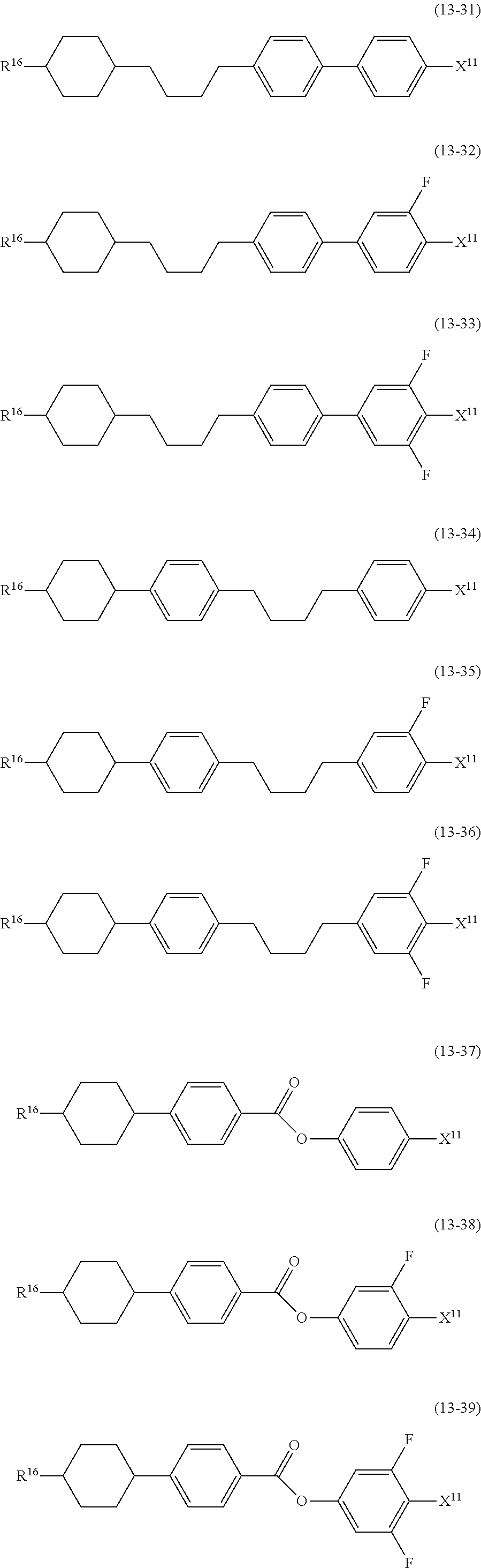 A symbol of terminal group R11 is used in a plurality of compounds in chemical formulas of component compounds. In the compounds, two groups represented by two pieces of arbitrary R11 may be identical or different. For example, in one case, R11 of compound (2) is ethyl and R11 of compound (3) is ethyl. In another case, R11 of compound (2) is ethyl and R11 of compound (3) is propyl. A same rule applies also to a symbol of R12, R13, Z11 or the like. In compound (15), when i is 2, two of ring E1 exists. In the compound, two groups represented by two of ring E1 may be identical or different. A same rule applies also to two of arbitrary ring E1 when i is larger than 2. A same rule applies also to other symbols.