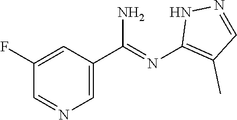 - GGVKJPHVSZRYMX-UHFFFAOYSA-N FC1=CC(C2=NC3=C(Br)C=NN3C(NCCC3=CNC4=C3C=CC=C4)=C2)=CN=C1 Chemical compound FC1=CC(C2=NC3=C(Br)C=NN3C(NCCC3=CNC4=C3C=CC=C4)=C2)=CN=C1 GGVKJPHVSZRYMX-UHFFFAOYSA-N 0.000 description 5