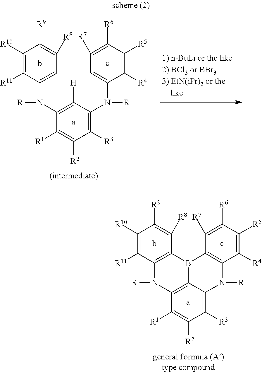 adjacent groups among R1 to R11 may be bonded to each other to form an aryl ring or a heteroaryl ring together with ring a, ring b, or ring c, at least one hydrogen atom in the ring thus formed may be substituted by an aryl, a heteroaryl, a diarylamino, a diheteroarylamino, an arylheteroarylamino, or an aryloxy, at least one hydrogen atom in these may be further substituted by an aryl, a heteroaryl, or a diarylamino,