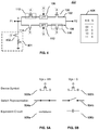FIG. 5B shows a FET device in an OFF or blocking mode (i.e., Vgs=0 for an enhancement mode N-channel device), along with an open switch representation and the equivalent circuit (i.e., the COFF capacitance of the FET device).