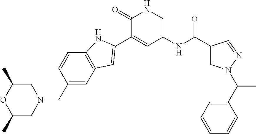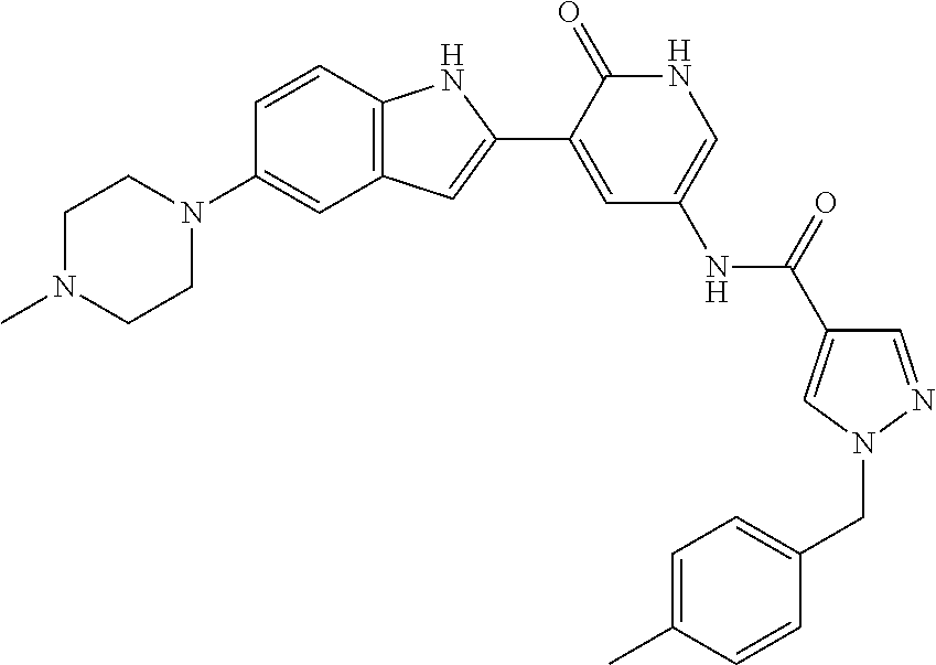 Concentrations of gemcitabine can be selected that in the absence of a CHK1 inhibitor, have no effect on cell survival but in the presence of a CHK1 inhibitor are highly cytotoxic. 10000 HT29 cells were plated per well of a 96 well plate and allowed to attach at 37° C. in a 5% CO2 humidified incubator for 18 hours. CHK1 inhibitors were then titrated in the presence of 10, 15 and 20 nM gemcitabine for 72 hours and the EC50 determined by staining with sulforhodamine B (SRB) and determining the absorbance at 540 nm.