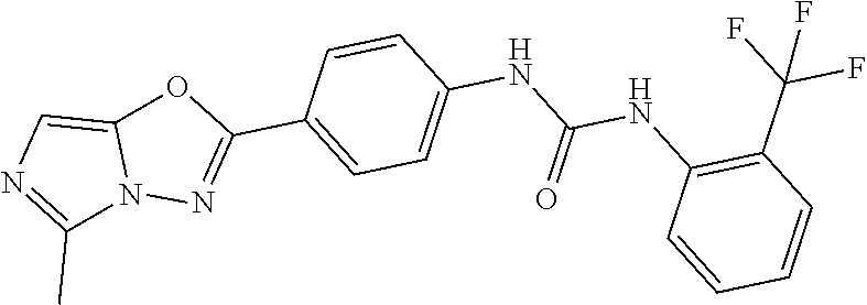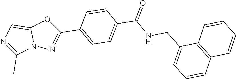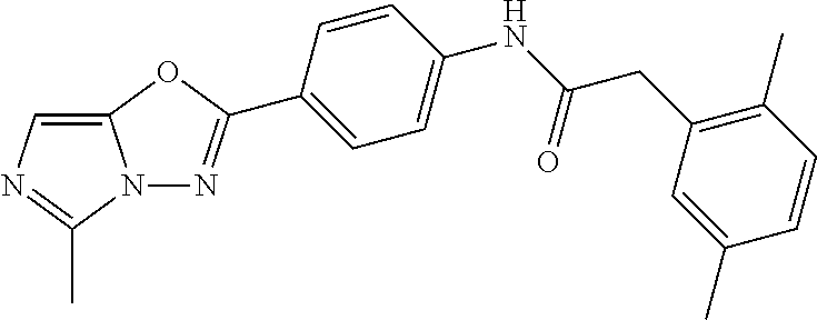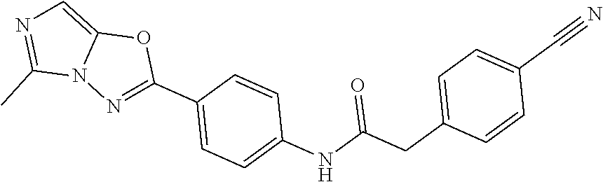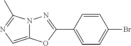 2-(4-Bromophenyl)-5-methylimidazo[5,1-b][1,3,4]oxadiazole (134.8 mg, 0.485 mmol), 4-phenyl-4,5,6,7-tetrahydrobenzo[d]thiazol-2-amine (111.5 mg, 0.485 mmol), Pd2dba3 (17.7 mg, 4 mol %) BINAP (12 mg, 4 mol %) and sodium t-butoxide (65 mg, 0.67) were placed in a carousel tube. 1,4-Dioxan was added and the reaction mixture was degassed for a further ten minutes. The reaction mixture was sealed and heated at 80° C. for 18 h. The reaction mixture was poured into aqueous sodium carbonate solution and extracted with ethyl acetate. The ethyl acetate extracts were combined, washed with brine, dried over magnesium sulphate, filtered and evaporated under reduced pressure to give an oil. The oil was purified by preparative HPLC to give the title compound (36.4 mg, 0.085 mmol, 17.5% yield).