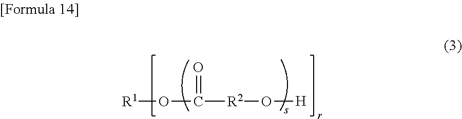 In the formula (3), “r” represents an integer of 1 to 20; R1 represents an organic group (organic residue) formed by removing a number “r” of hydroxy groups from the structural formula [R1(OH)r] of a compound having a number “r” of hydroxy groups per molecule; “s” means the number of repetition of structures (lactone units) in a bracket with “s”, and represents an integer of 0 to 10; the total number of “s” in the formula (3) is an integer of 1 or more; and R2 represents an alkylene group.