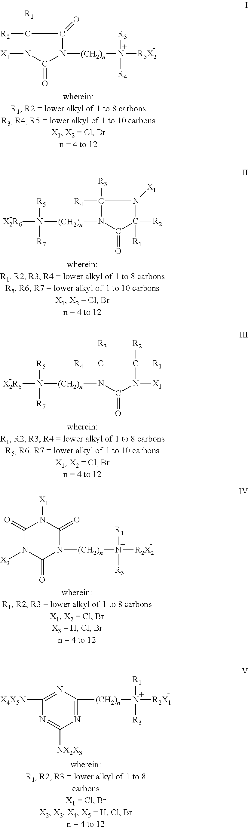 In specific embodiments, the water soluble N-halamine is preferably at least one cationic N-halamine from the following Quaternary Ammonium Moieties (QAMs)-based N-halamines including, but not limited to, 1-chloro-3-bromoalkyltrimethylammonium-4,4,5,5-tetramethyl imidazolidin-2-one, 1-bromo-3-bromoalkyltrimethylammonium-4,4,5,5-tetramethyl imidazolidin-2-one, 1-chloro-3-bromoalkyltrimethylammonium-2,2,5,5-tetramethyl imidazolidin-4-one, 1-bromo-3-bromoalkyltrimethylammonium-2,2,5,5-tetramethyl imidazolidin-4-one, 2-chloro-4-bromoalkyltrimethylammonium-1,3,5-triazine-2,4,6-triamine, 2-bromo-4-bromoalkyltrimethylammonium-1,3,5-triazine-2,4,6-triamine, 1-chloro-3-bromoalkyltrimethylammonium-5,5-dimethylhydantoin, and 1-bromo-3-bromoalkyltrimethylammonium-5,5-dimethylhydantoin, etc. The alkyl can be lower alkyl of 4 to 12 carbons.