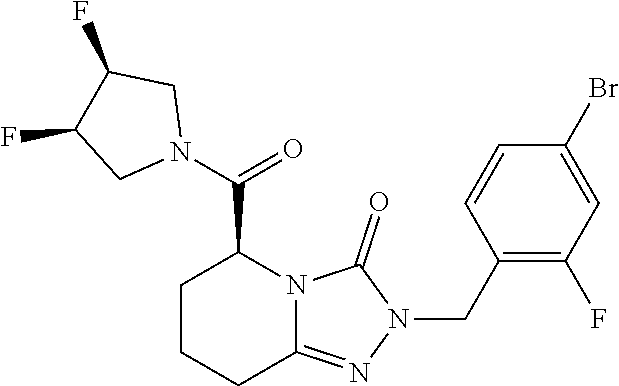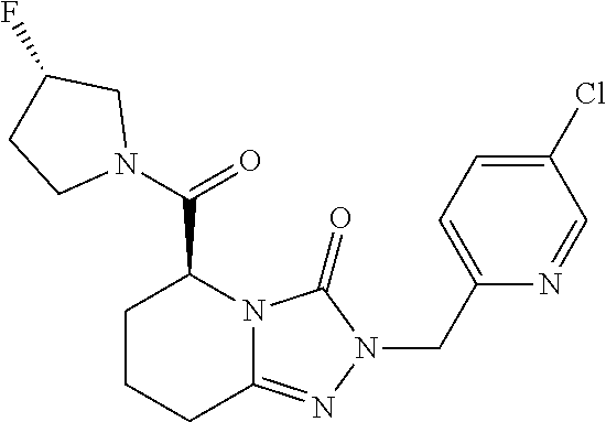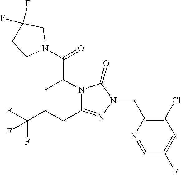 Structure from Example 454: (5S)-2-(3-Chloro-4-fluorobenzyl)-5-{[(3S)-3-fluoropyrrolidin-1-yl]carbonyl}-5,6,7,8-tetrahydro[1,2,4]triazolo[4,3-a]pyridin-3(2H)-one with the following formula: