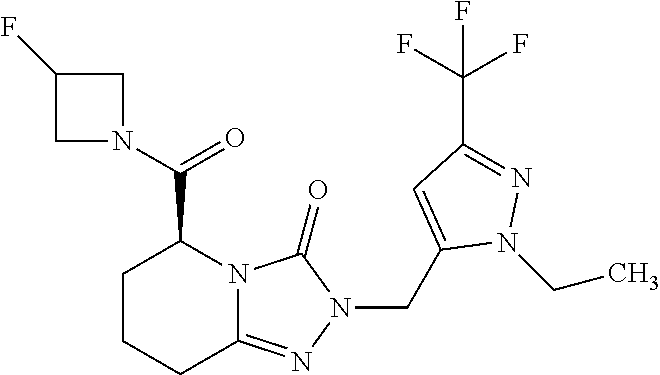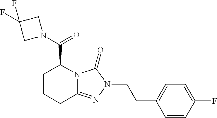 Structure from Example 113: (5S)-5-[(3-Fluoroazetidin-1-yl)carbonyl]-2-(4-methylbenzyl)-5,6,7,8-tetrahydro[1,2,4]triazolo[4,3-a]pyridin-3(2H)-one with the following formula: