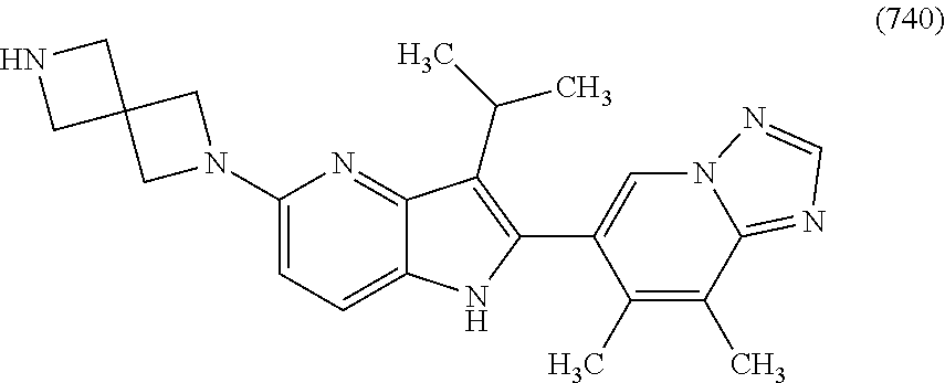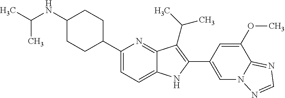 - MMWHJOFACSUATG-UHFFFAOYSA-N C(C)(C)C1=C(NC=2C1=NC(=C(C=2)C)C1CCNCC1)C=1C=C(C=2N(C=1)N=CN=2)OC Chemical compound C(C)(C)C1=C(NC=2C1=NC(=C(C=2)C)C1CCNCC1)C=1C=C(C=2N(C=1)N=CN=2)OC MMWHJOFACSUATG-UHFFFAOYSA-N 0.000 claims 2