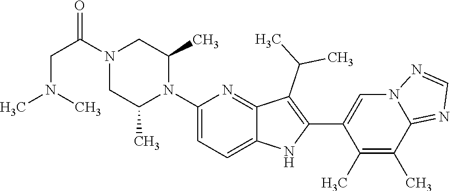 - PVBXOQLQMLQDEG-UHFFFAOYSA-N C(C)(C)C1=C(NC=2C1=NC(=C(C=2)C)C1CCN(CC1)CC(C)(O)C)C=1C=C(C=2N(C=1)N=CN=2)C Chemical compound C(C)(C)C1=C(NC=2C1=NC(=C(C=2)C)C1CCN(CC1)CC(C)(O)C)C=1C=C(C=2N(C=1)N=CN=2)C PVBXOQLQMLQDEG-UHFFFAOYSA-N 0.000 claims 2