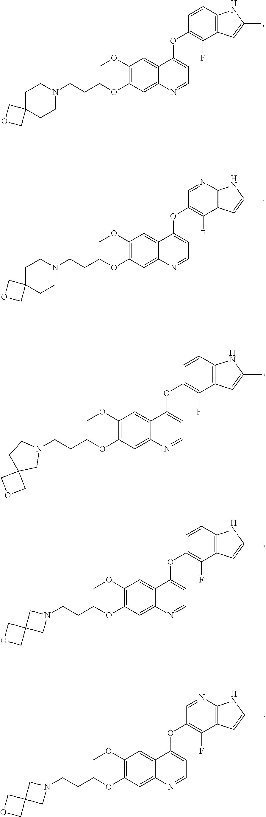 - DKPBRPMCBZVOQH-UHFFFAOYSA-N COC1=C(OCCCN2CC3(COC3)C2)C=C2/N=C\C=C(\OC3=C(F)C4=C(CC(C)=C4)N=C3)C2=C1.COC1=C(OCCCN2CC3(COC3)C2)C=C2/N=C\N=C(\OC3=C(F)C4=C(CC(C)=C4)N=C3)C2=C1.COC1=C(OCCCN2CCC3(CC2)COC3)C=C2/N=C\C=C(\OC3=CC4=C(C=C3)CC(C)=C4)C2=C1.COC1=C(OCCCN2CCC3(CC2)COC3)C=C2/N=C\N=C(\OC3=CC4=C(C=C3)CC(C)=C4)C2=C1 Chemical compound COC1=C(OCCCN2CC3(COC3)C2)C=C2/N=C\C=C(\OC3=C(F)C4=C(CC(C)=C4)N=C3)C2=C1.COC1=C(OCCCN2CC3(COC3)C2)C=C2/N=C\N=C(\OC3=C(F)C4=C(CC(C)=C4)N=C3)C2=C1.COC1=C(OCCCN2CCC3(CC2)COC3)C=C2/N=C\C=C(\OC3=CC4=C(C=C3)CC(C)=C4)C2=C1.COC1=C(OCCCN2CCC3(CC2)COC3)C=C2/N=C\N=C(\OC3=CC4=C(C=C3)CC(C)=C4)C2=C1 DKPBRPMCBZVOQH-UHFFFAOYSA-N 0.000 description 2