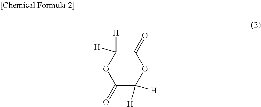 Glycolide is a compound represented by the chemical formula (2) below and is a cyclic ester formed from two molecules of glycolic acid.