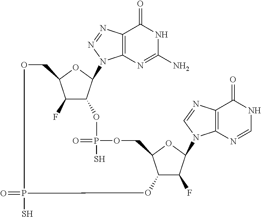 - YGBCJGXZGGCNHZ-POTQXXGBSA-N NC1=CC=NC2=C1C=CN2[C@@H]1O[C@@H]2COP(O)(=S)O[C@@H]3C[C@@H](COP(O)(=S)O[C@H]2[C@@H]1F)O[C@H]3N1N=NC2=C1N=C(N)NC2=O.NC1=CC=NC2=C1N=CN2[C@@H]1O[C@@H]2COP(O)(=S)O[C@@H]3[C@H](F)[C@@H](COP(O)(=S)O[C@H]2[C@@H]1F)O[C@H]3N1N=NC2=C1N=C(N)NC2=O.NC1=CC=NC2=C1N=CN2[C@@H]1O[C@@H]2COP(O)(=S)O[C@@H]3[C@H](F)[C@@H](COP(O)(=S)O[C@H]2[C@@H]1F)O[C@H]3N1N=NC2=C1N=C(N)NC2=O Chemical compound NC1=CC=NC2=C1C=CN2[C@@H]1O[C@@H]2COP(O)(=S)O[C@@H]3C[C@@H](COP(O)(=S)O[C@H]2[C@@H]1F)O[C@H]3N1N=NC2=C1N=C(N)NC2=O.NC1=CC=NC2=C1N=CN2[C@@H]1O[C@@H]2COP(O)(=S)O[C@@H]3[C@H](F)[C@@H](COP(O)(=S)O[C@H]2[C@@H]1F)O[C@H]3N1N=NC2=C1N=C(N)NC2=O.NC1=CC=NC2=C1N=CN2[C@@H]1O[C@@H]2COP(O)(=S)O[C@@H]3[C@H](F)[C@@H](COP(O)(=S)O[C@H]2[C@@H]1F)O[C@H]3N1N=NC2=C1N=C(N)NC2=O YGBCJGXZGGCNHZ-POTQXXGBSA-N 0.000 description 2