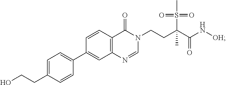 | 20 | (2R)-4-(6-fluoro-7-{4-[(morpholin-4- yl)methyl]phenyl}-4-oxo-3,4- dihydroquinazolin-3-yl)-N-hydroxy-2- methanesulfonyl-2-methylbutanamide | |