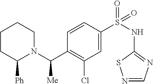 - IJGLQRKSMNQEGW-FOIQADDNSA-N C[C@H](C1=C(Cl)C=C(S(=O)(=O)NC2=NC=NS2)C=C1)N1CCCC[C@@H]1C1=CC=CC=C1 Chemical compound C[C@H](C1=C(Cl)C=C(S(=O)(=O)NC2=NC=NS2)C=C1)N1CCCC[C@@H]1C1=CC=CC=C1 IJGLQRKSMNQEGW-FOIQADDNSA-N 0.000 description 3
