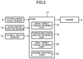 As depicted in FIG. 3, upon start of the engine control processing, in step S1, the PCM 14 operates to acquire various information about the driving state of the vehicle 1. Specifically, the PCM 14 operates to acquire, as information about the driving state, detection signals output from the aforementioned various sensors, including the steering wheel angle detected by the steering wheel angle sensor 8, the accelerator position detected by the accelerator position sensor 10, the vehicle speed detected by the vehicle speed sensor 12, and a gear stage currently set in a transmission of the vehicle 1.