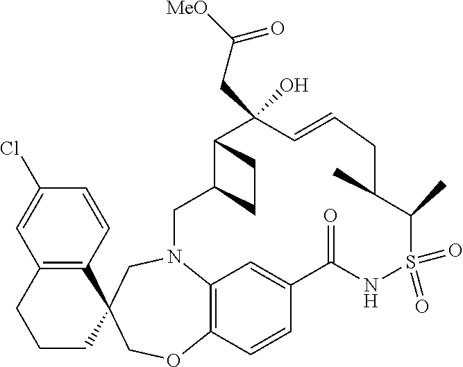 - PBSIIHFSFVXSDY-ANJFVXRTSA-N C[C@H]1CC/C=C/[C@](C)(O)[C@@H]2CC[C@H]2CN2C[C@@]3(CCCC4=CC(Cl)=CC=C43)COC3=C/C=C(/C=C/32)C(=O)NS1(=O)=O Chemical compound C[C@H]1CC/C=C/[C@](C)(O)[C@@H]2CC[C@H]2CN2C[C@@]3(CCCC4=CC(Cl)=CC=C43)COC3=C/C=C(/C=C/32)C(=O)NS1(=O)=O PBSIIHFSFVXSDY-ANJFVXRTSA-N 0.000 description 4