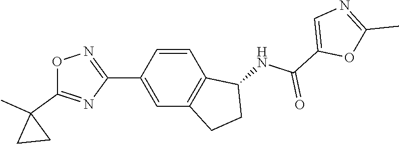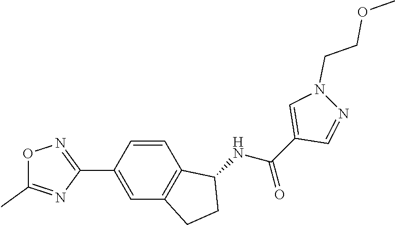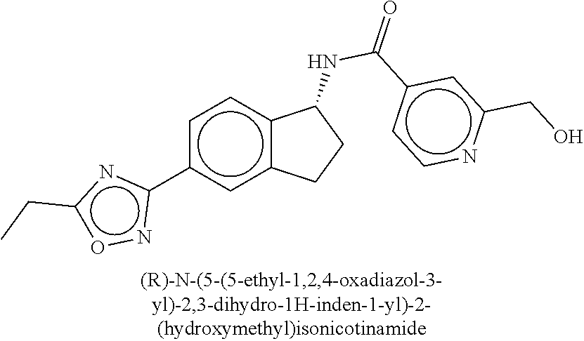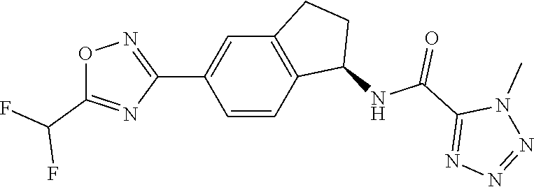 For oral dosing studies, three pre-dose baseline M-Mode images were taken at 1 minute intervals prior to compound administration. Compounds were formulated in a 0.5% hydroxypropyl methylcellulose 2910 (HPMC 2910): 0.1% Tween 80 suspension and delivered as a single dose (5 mL/kg) by oral gavage. Rats were lightly anesthetized for M-Mode echocardiography measurements at select time points over a 24 hour period. Different dose levels were evaluated for each compound. The compound effect on cardiac fractional shortening at the highest dose evaluated is presented in Table D as a percent reduction of baseline fractional shortening (=100%).