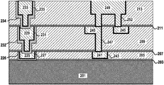 At this point in the process, the first and second levels of the crack stop structure and the interconnection metallurgy structure are already fabricated. First and second capping layers 203, 207 separate the first and second dielectric layers 205, 209. The first layer of the crack stop structure is comprised of first level metal 225, high modulus layer 226 and barrier layer 227; the second layer of the crack stop structure is comprised of second level metal 229, high modulus layer 232 and barrier layer 231. The first level of the interconnection structure is comprised of first level metal 241 and barrier layer 243 and the second level of the interconnection is comprised of the second level metal 245 and the barrier layer 247. In preferred embodiments, the metal and barrier materials, when used, are the same on a given level as compared between the crack stop and metallurgy on that level. As will be discussed later, in some embodiments of the invention, the metal and barrier material may not be used in a given level of the crack stop. The metal and barrier materials can be the same throughout different levels of the structures or different between levels. Typically, the levels have respective total thicknesses from 50 nm to 800 nm with a total thickness from 80 nm to 500 nm being more preferred, but this is largely dependent on the interconnection technology used.