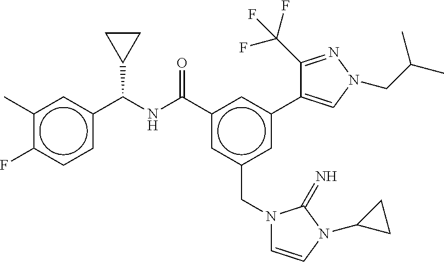Intrinsic histone methyltransferase (HMT) activity of MLL1 is extremely low and requires a complex assembly of WDR5, RbBP5, ASH2L, and DPY30 protein partners for effective H3K4 trimethylation, the so-called WRAD complex (Patel, A.; et al. J. Biol. Chem., 2009, 284, 24242-56). The binding of MLL1 to WDR5 (WD40 repeat protein 5) is particularly critical for HMT activity and occurs through a conserved arginine containing motif on MLL1 called the “Win” or WDR5 interaction motif. Thus, targeting inhibitors of the MLL1-WDR5 interaction at the WIN site in order to block MLL1 methyltransferase activity could represent a promising therapeutic strategy for treating MLL leukemia patients. Peptidomimetics have been discovered that bind tightly to WDR5 at the MLL site, inhibit MLL1 methyltransferase activity, and block proliferation of MLL1 cells by inducing cell-cycle arrest, apoptosis, and myeloid differentiation (Cao, F.; et al. Molecular Cell, 2014, 53, 247-61, Karatas, H.; et al. J. Med. Chem., 2017, 60, 4818-4839.). In addition, altered gene expression patterns similar to MLL1 deletion are observed, supporting a role for MLL1 activity in regulating MLL1-dependent leukemia transcription. Thus, interruption of the WDR5-MLL1 interaction may be a useful strategy for treating patients with MLL leukemias. In addition to the highly characterized WDR5-MLL1 interaction, disruption of WDR5 with other transcription factors/epigenetic writers or displacement from chromatin itself could have a desirable benefit as a cancer treatment strategy. For example, WDR5 acts as a scaffold protein with the following chromatin complexes/structures, including histone H3 (via R2 residues, e.g. see Song, J.-J., et al. J. Biol. Chem. 2008, 283, 35258-64), NSL/MOF (Li, X., et al. Molecular and Cellular Biology, 2010, 30, 5335-47, Dias, J., et al. Genes & Development, 2014, 28, 929-942.), C/EBPα p30 (Senisterra, G., et al. Biochem. 1, 2013, 449, 151-159.), c-MYC (Thomas, L. R.; et al. Molecular Cell, 2015, 58, 440-52, herein incorporated by reference in its entirety), and the NuRD complex (Ee, L.-S., et al. Stem Cell Reports, 2017, 8, 1488-96.). In addition, WDR5 expression levels have been reported to be correlative and connected to patient prognosis in several other cancer types, including neuroblastoma (Sun, Y. et al. Cancer Research, 2015, 75, 5143-54.), breast cancer (Dai, X. et al. PLoSOne, 2015, 10, PMC4565643), bladder cancer (Chen, X. et al. Scientific Reports, 2015, 5, 8293.), and colorectal cancer (Tan, X. et al. CellDeath & Disease, 2017, 8, PMC5386518). In addition, in an unbiased shRNA screen in human xenografts, WDR5 was identified as an important target in pancreatic cancer (Carugo, A. et al. Cell Reports, 2016, 16, 133-147.). Based on the growing number of complexes identified which utilize WDR5 to maintain tumor fitness and growth, the emerging importance of WDR5 in several cancer types is not unexpected. In the case of the c-MYC-WDR5 interaction, the MYC oncoprotein utilizes a molecularly defined interaction with WDR5 to bind to its target genes on chromatin. MYC is overexpressed in a majority of malignancies and contributes to an estimated 70,000-100,000 cancer deaths per year in the United States. Thus, disruption of WDR5 from chromatin as a strategy to displace MYC from its target genes may provide a beneficial strategy to treat MYC-driven tumors.