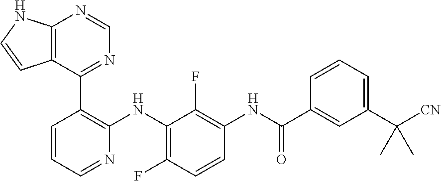 - IUHOYUMIDXUAMD-UHFFFAOYSA-N CC(C)(C#N)C1=CC(C(=O)NC2=CC=C(CC3=NC=CC=C3C3=NC=NC4=C3N=CC4)C(F)=C2)=CC=C1 Chemical compound CC(C)(C#N)C1=CC(C(=O)NC2=CC=C(CC3=NC=CC=C3C3=NC=NC4=C3N=CC4)C(F)=C2)=CC=C1 IUHOYUMIDXUAMD-UHFFFAOYSA-N 0.000 description 4