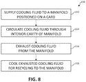 FIG. 8 is a flowchart of an example method 150 for operating a cooling system including cooling manifolds in accordance with one or more example implementations and techniques described in this disclosure. Method 150 is describe as being performed using manifold 11 and card(s) 10 illustrated and described throughout this disclosure. However, examples of method 150 are not necessarily limited to being executed using manifold 11 and assembly 10, or any equivalent thereof, and other versions of cooling manifolds that may be installed on an electrical or computer card and used for cooling slot-mounted electrical modules receive at the card may be utilized to perform method 150.