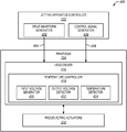 FIG. 4 is a block diagram illustrating a drive circuit 400 for printhead 104 in an illustrative embodiment. Drive circuit 400 is an apparatus or assembly of circuits/devices that controls printhead 104 to eject a print fluid on a medium to form pixels on the medium. Drive circuit 400 includes a drive waveform generator 402 configured to generate a drive waveform 404 (e.g., a trapezoidal waveform), and provide the drive waveform 404 to printhead 104 as a drive signal for piezoelectric actuators 310. Although not illustrated, drive waveform generator 402 may also include an amplifier circuit that amplifies the current of drive waveform 404. Drive circuit 400 also includes a control signal generator 406 configured to provide one or more control signals 408 to printhead 104 for selectively applying drive waveform 404 to individual jetting channels 302. Control signal generator 406 may receive image data, such as serial data, that specifies non-jetting or jetting by individual jetting channels 302 for pixels. One example of image data is a bitmap that defines pixel locations and values for each pixel location. In one embodiment, the image data may include two-bit values that define different grey-scale levels for individual pixels. In this example, a value of “00” may define non-jetting for a pixel by a jetting channel 302. A value of “01”, “10”, and “11” may define jetting of one, two, or three droplets for a pixel by a jetting channel 302, respectively. Control signal generator 406 may process the image data, and generate control signals 408 that include data signals, latch signals, a serial clock, gating signals, etc.